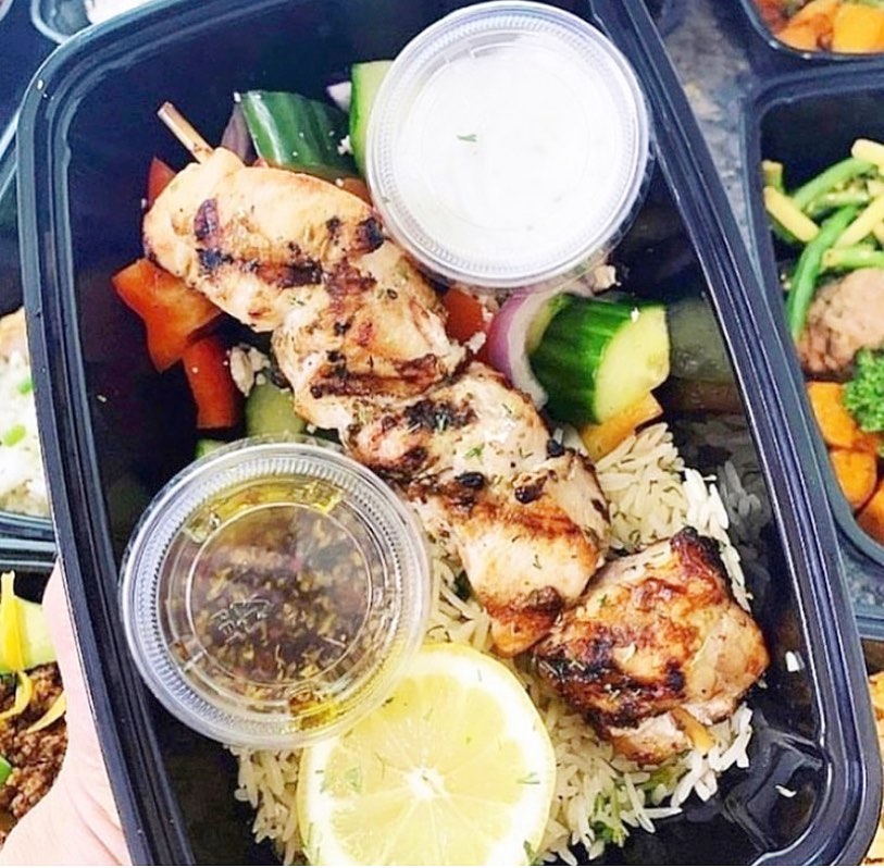 Tender seasoned Greek skewers served on a bed of long grain lemon dill rice and greek salad.